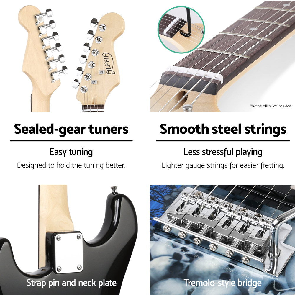 Often emulated for its classic shape and superb tones, the Stratocaster has been the definitive electric guitar for more than 60 years. And our Alpha Strat-style Electric Guitar aims to help you fulfill your passion of playing this iconic legend at a very affordable price. Great for beginners, the Alpha Electric Guitar comprises a comfortable and glossy Poplar body with a Canadian maple neck and Rosewood fretboard. The neck is smooth and the 22 frets are designed to enable you to play with ease. Not least, the 3-way pickup switch allows you to select your favourite tones from the warm timbre of the open coil humbucker pickups. In short, this versatile guitar will suit any genre of music, from rock, pop, blues, to funk, country and more. Also included with the electric guitar is a snazzy whammy bar for the tremolo bridge, cable, guitar bag and other useful accessories.