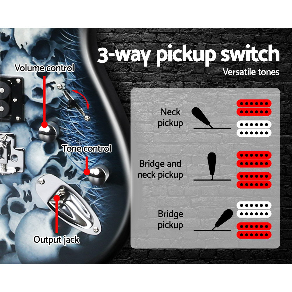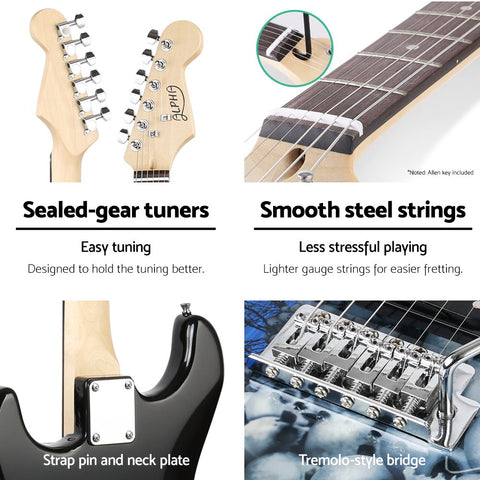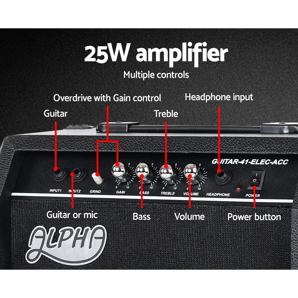 And to make things even easier for you to get started on your music escapades, our combo set also includes a 25W guitar amplifier with dual inputs and controls for bass, treble, gain, and clean and overdrive modes. There is also a headphone input to stop the neighbors from complaining night and day. So rock on with the Alpha Electric Guitar Combo Set for heaps of awesome coolness.